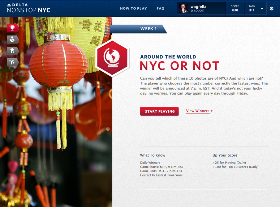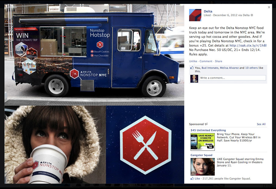 Delta Nonstop NYC was a six-week, kitchen-sink, digital promotion for Delta Air Lines that included physical scavenger hunts, mobile check-ins, custom games, a photo contest, a food truck, a private concert with F.U.N. in LA, and a bunch of other stuff.